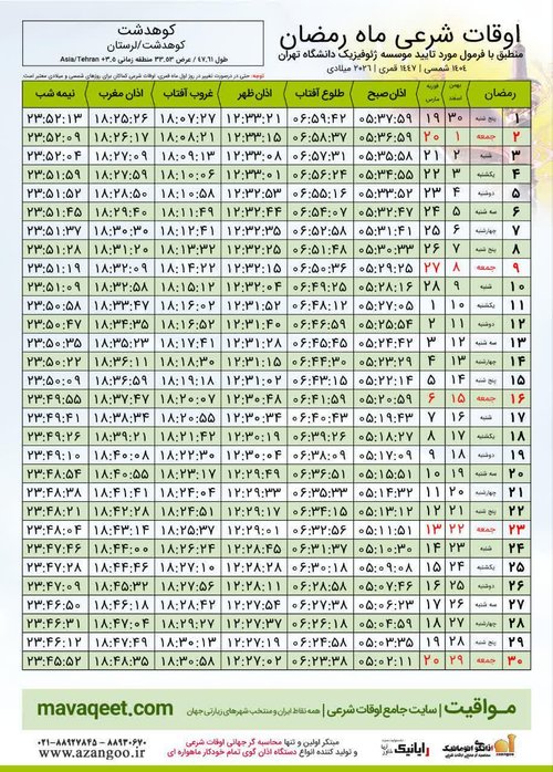 اوقات شرعی ماه مبارک رمضان در شهر کوهدشت